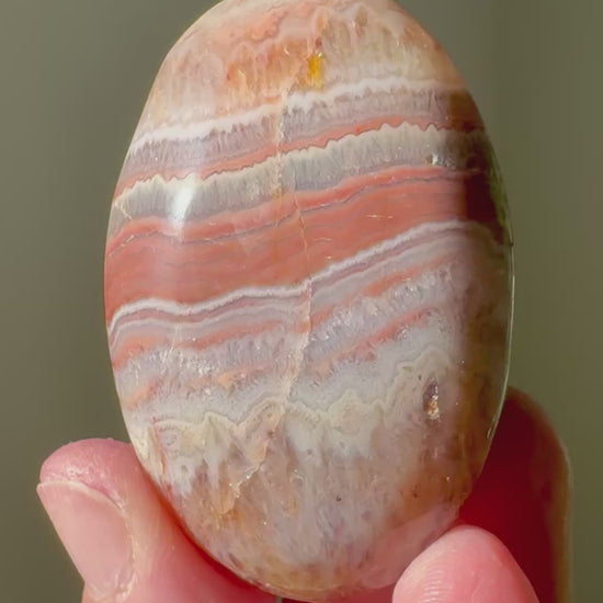 This Agathyst palm stone combines amethyst, agate, and chalcedony in a smooth, hand-held form, showcasing red and purple tones with soft, earthy banding. Its polished surface and gentle weight make it perfect for meditation, energy work, or carrying soothing, grounding energy throughout the day.