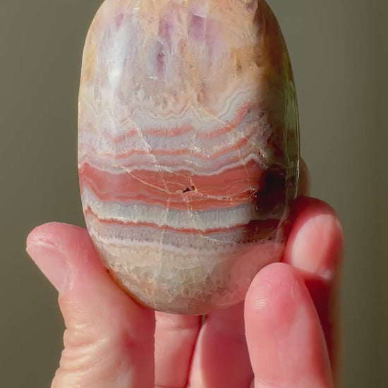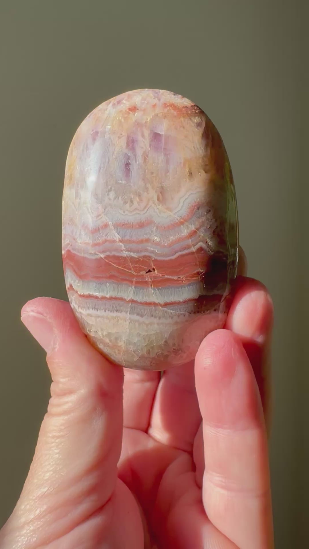 This Agathyst palm stone combines amethyst, agate, and chalcedony in a smooth, hand-held form, showcasing red and purple tones with soft, earthy banding. Its polished surface and gentle weight make it perfect for meditation, energy work, or carrying soothing, grounding energy throughout the day.