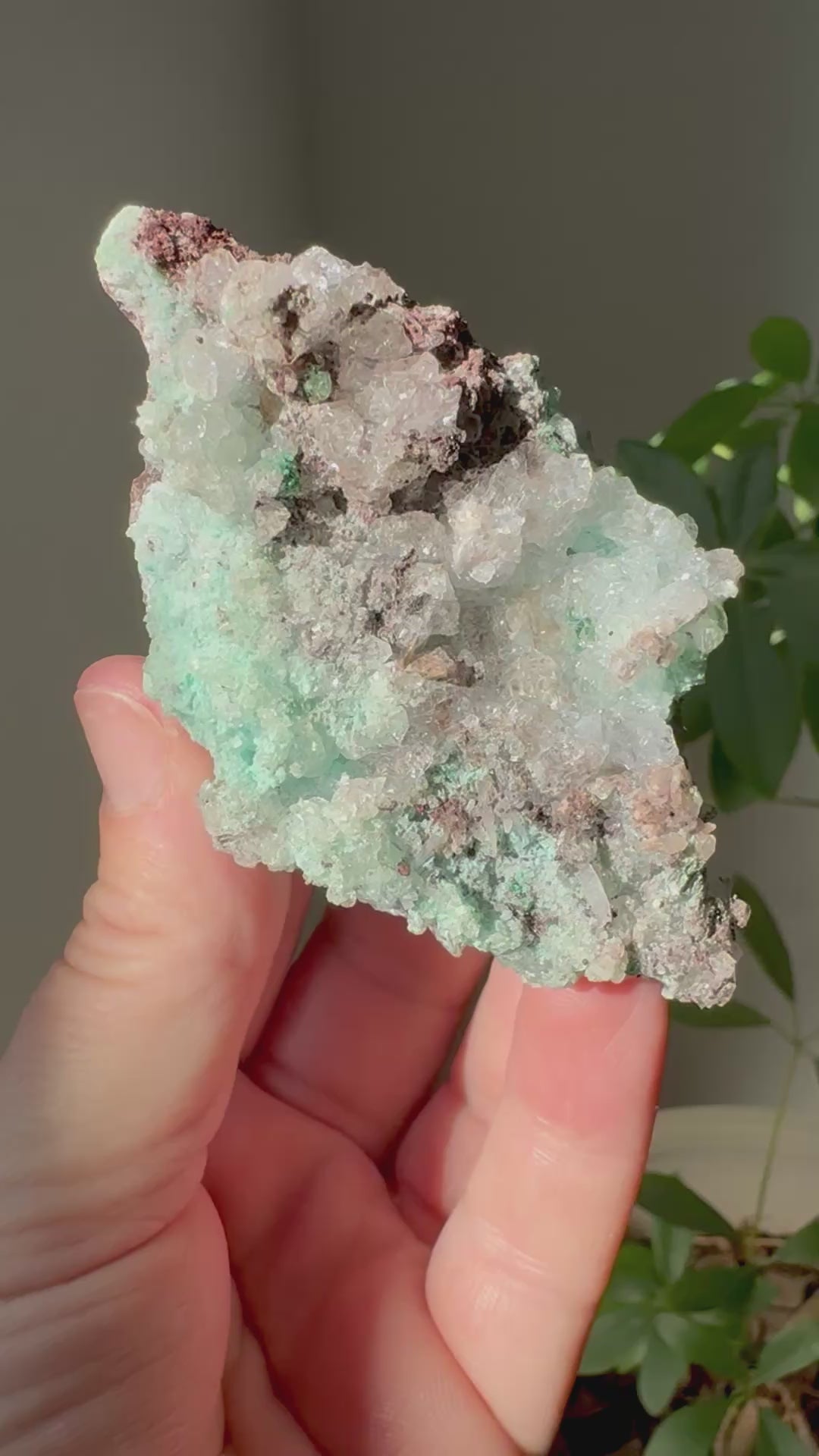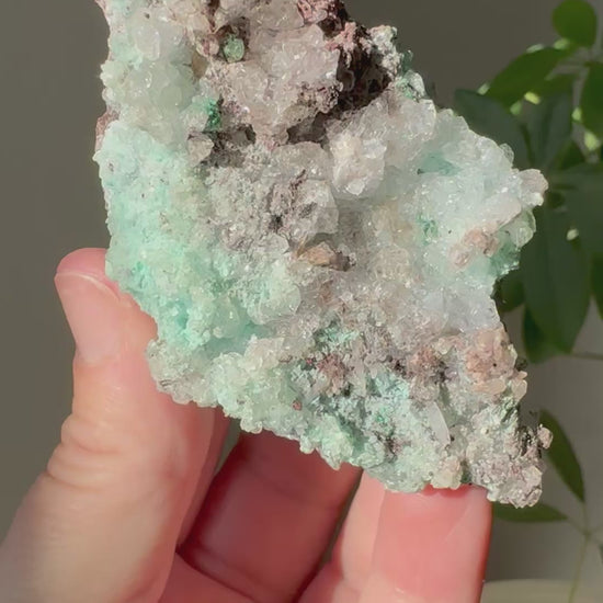 Discover the soothing allure of Auracalcite, a cluster of soft blue-green crystals that shimmer with natural pastel tones. Its intricate, airy formation is as mesmerizing to observe as it is comforting to hold, making it perfect for meditation altars, desks, or shelves.
