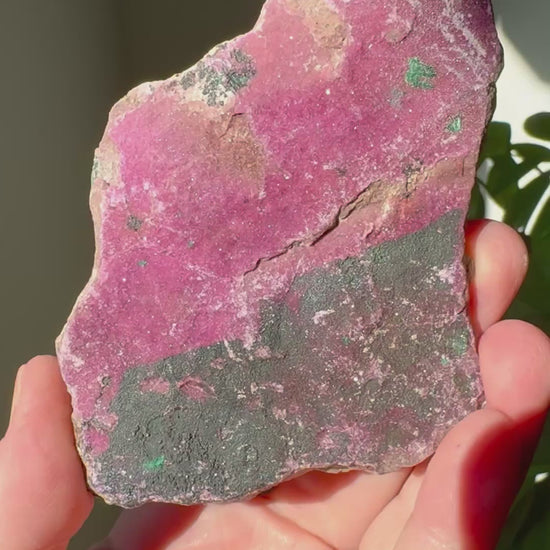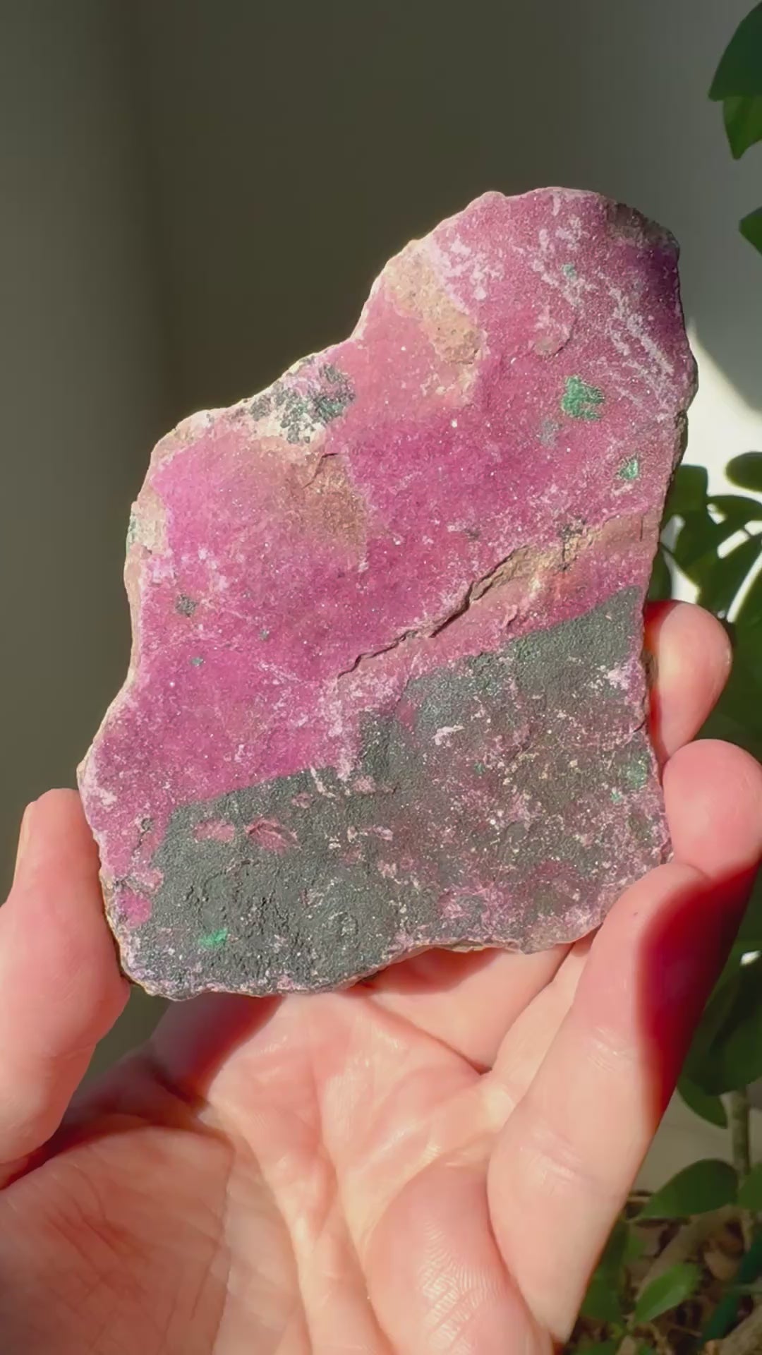 This Cobaltoan Calcite with Malachite specimen features vibrant pink Cobaltoan Calcite intertwined with rich green Malachite, creating a striking contrast of color and energy. Its natural formation and sparkly surfaces make it a captivating piece for display or energetic work, radiating both uplifting and grounding vibes.