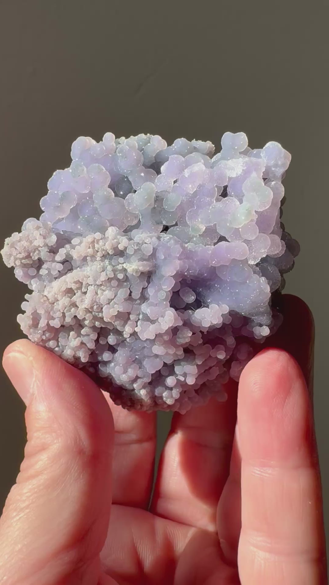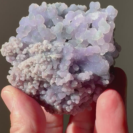 Experience the playful elegance of Grape Agate, a unique formation of tiny, botryoidal chalcedony spheres that resemble clusters of deep purple grapes. Each piece showcases rich, soothing shades of violet and lavender, with a natural, rounded texture that makes it both mesmerizing to observe and delightful to hold. Its compact, clustered form makes it perfect for display on desks, shelves, or meditation altars, where it can add a pop of color and an uplifting natural presence.