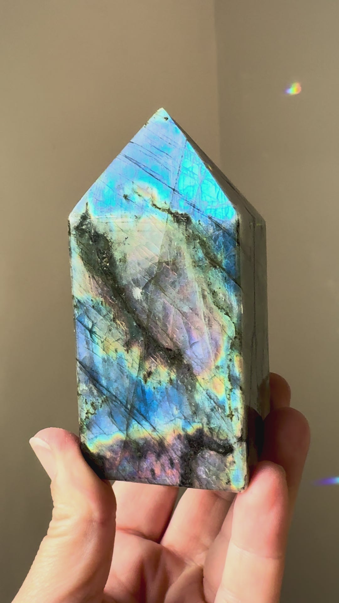 A Labradorite tower, with its upward-pointing form, is thought to channel energy vertically—helping you elevate your intentions, rise above old patterns, and invite clarity, confidence, and spiritual expansion into your daily life.