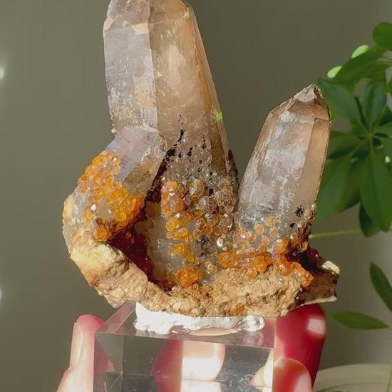 Bring warmth, balance, and revitalizing energy into your space with this Spessartine Garnet and Smoky Quartz specimen.