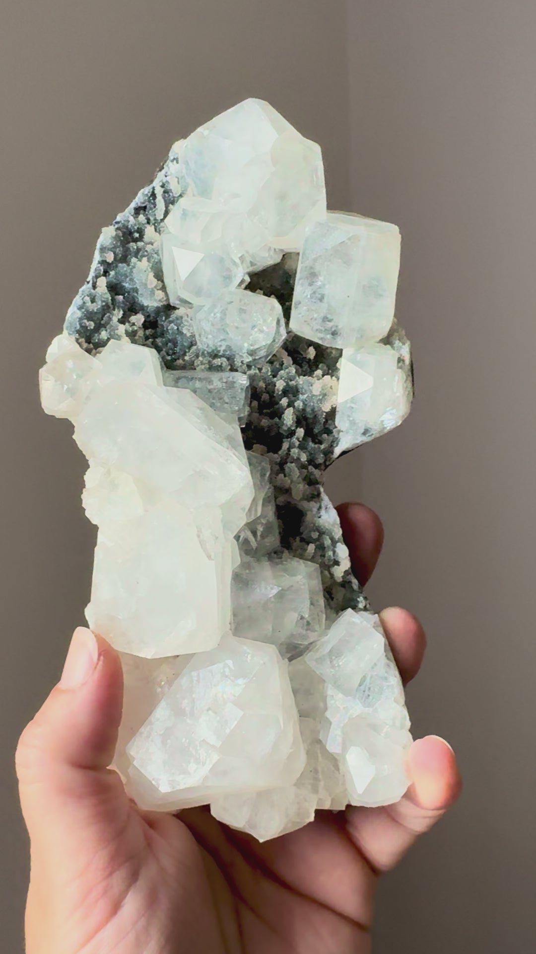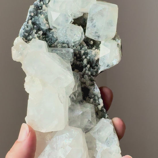 Bring clarity, serenity, and harmonious energy into your space with this Apophyllite, Stilbite, and Chalcedony specimen.